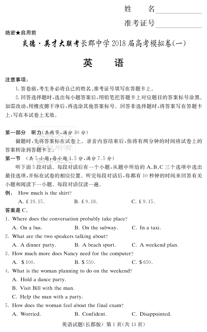 【英語(yǔ)】炎德英才大聯(lián)考2018長(zhǎng)郡中學(xué)高三9次月考(模擬一)