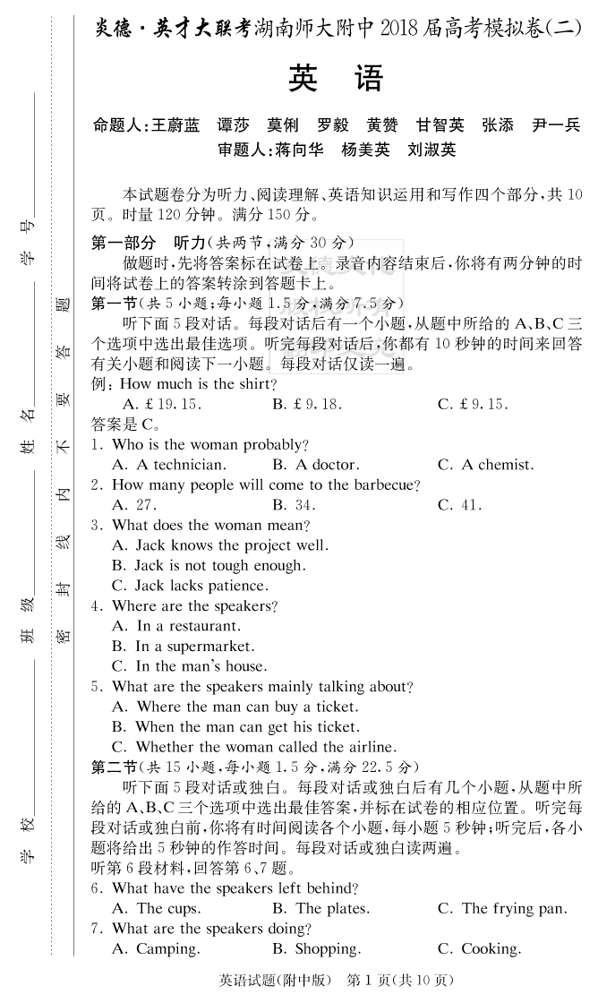【英語】炎德英才大聯考2018師大附中高三9次月考(模擬二)
