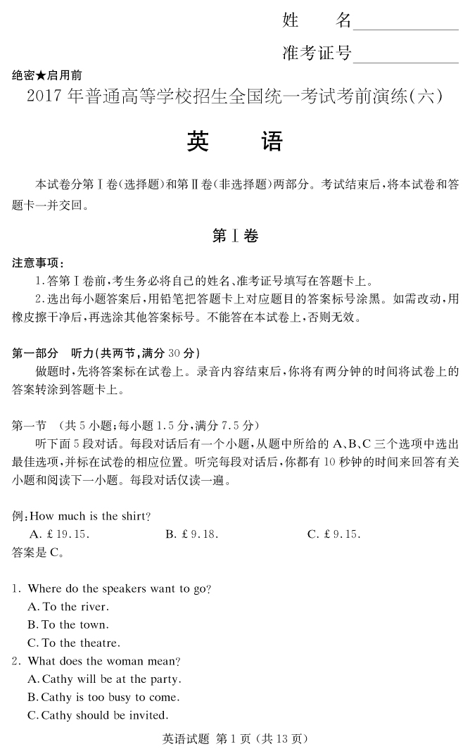 【英語】2017年普通高等學校招生全國統一考試考前演練(六)