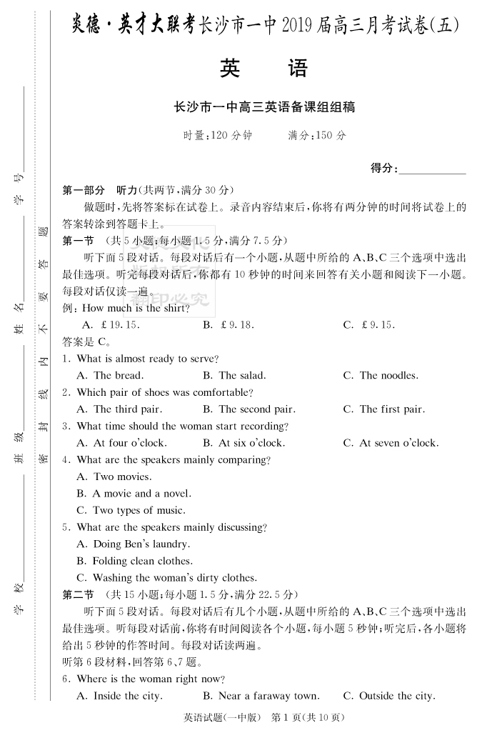 【英語】炎德英才大聯考2019長沙一中高三5次月考