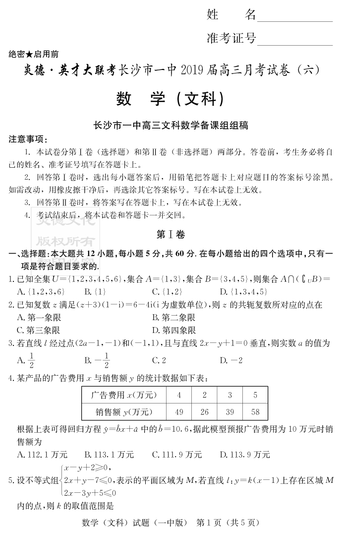 【文數】炎德英才大聯考2019長沙一中高三6次月考