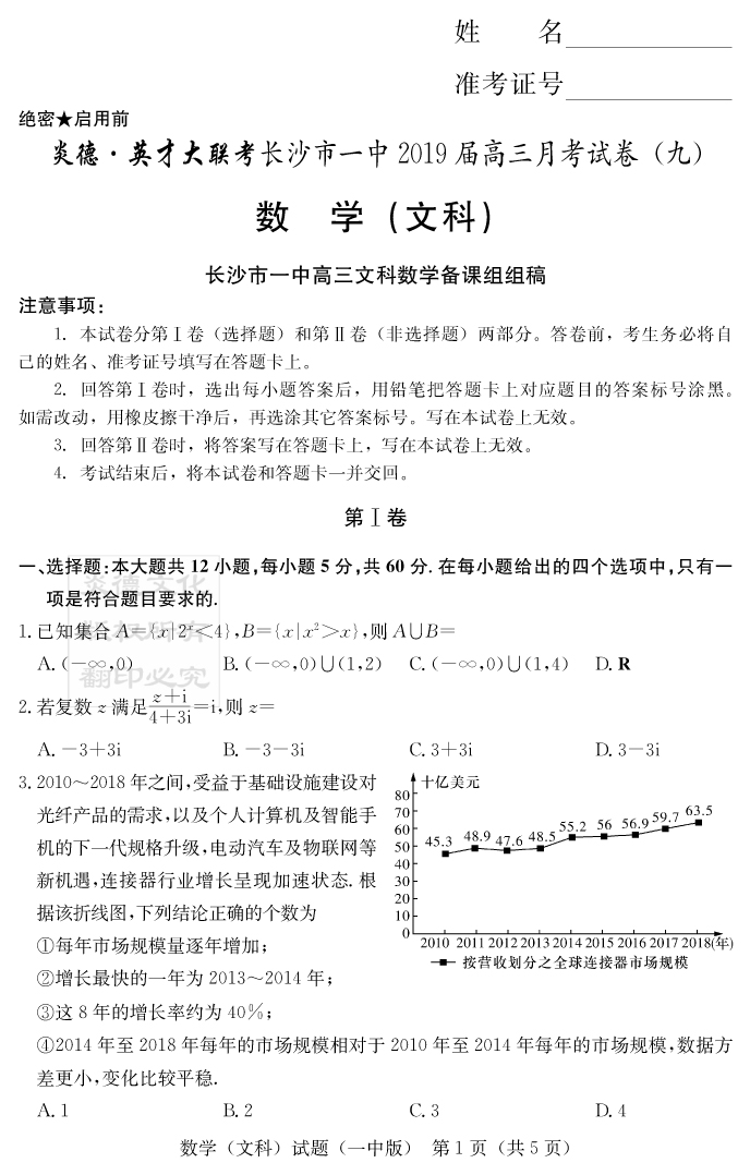 【文數】炎德英才大聯考2019長沙一中高三9次月考