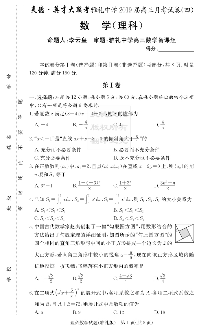 【理數】炎德英才大聯考2019雅禮中學高三4次月考