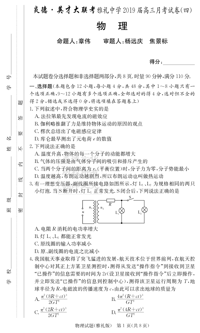 【物理】炎德英才大聯考2019雅禮中學高三4次月考