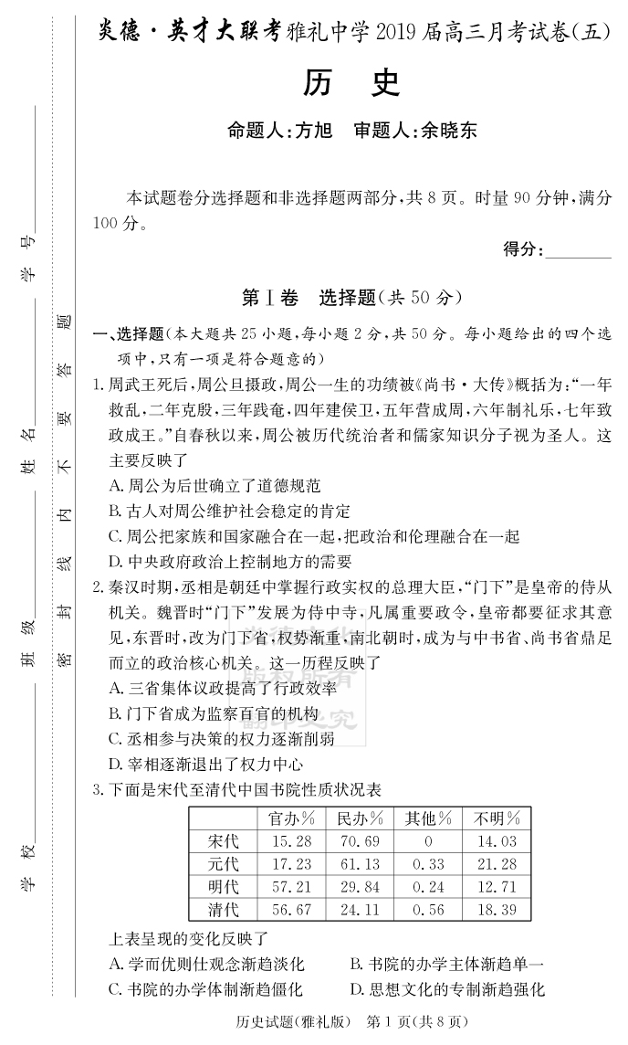 【歷史】炎德英才大聯考2019雅禮中學高三5次月考