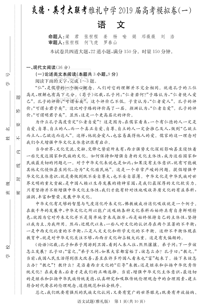 【語文】炎德英才大聯考2019雅禮中學高三9次月考(模擬一)