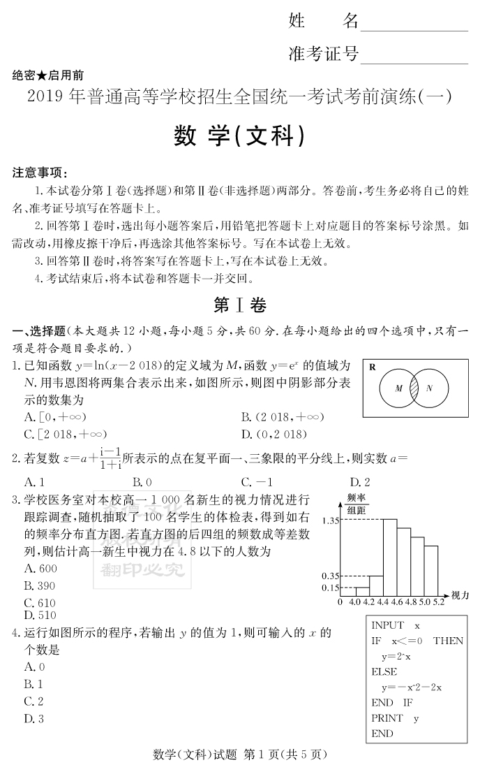 【文數】2019年普通高等學校招生全國統一考試考前演練(一)