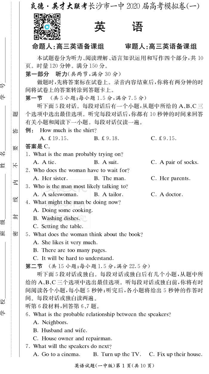 【英語】炎德英才大聯考2020屆長沙市一中高三9次月考(模擬一)