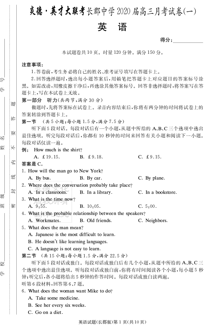 【英語】炎德英才大聯(lián)考2020屆長郡中學(xué)高三1次月考