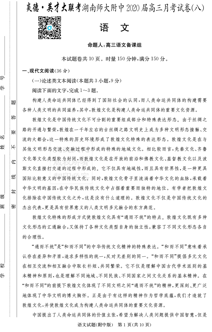 【語文】炎德英才大聯考2020屆師大附中高三8次月考