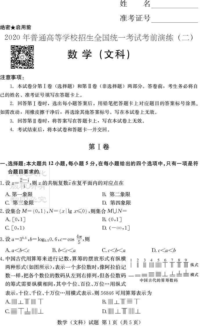 【文數(shù)】2020年普通高等學(xué)校招生全國統(tǒng)一考試考前演練(二)