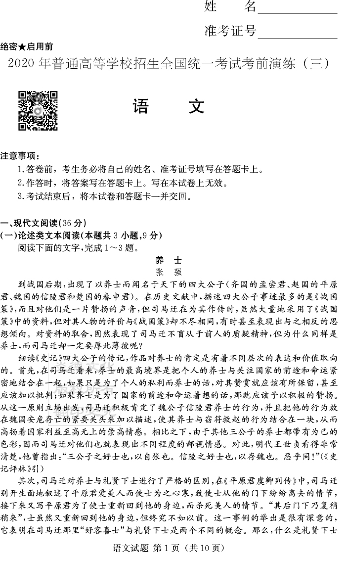 【語文】2020年普通高等學校招生全國統一考試考前演練(三)