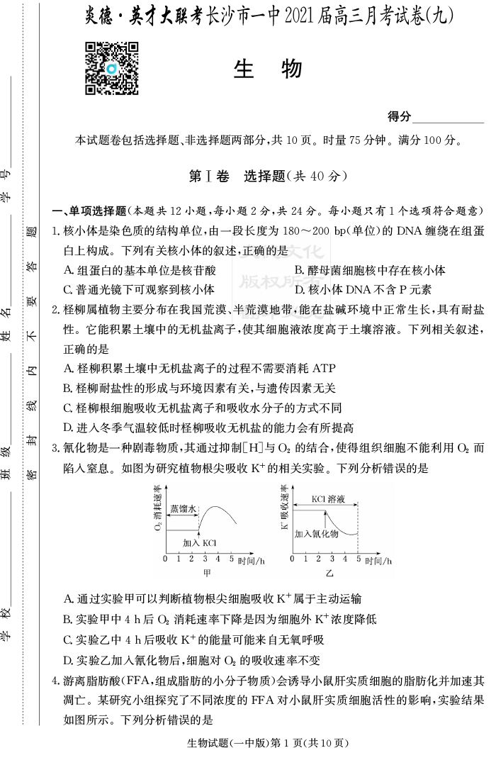 【生物】炎德英才大聯考2021屆長沙市一中高三9次月考