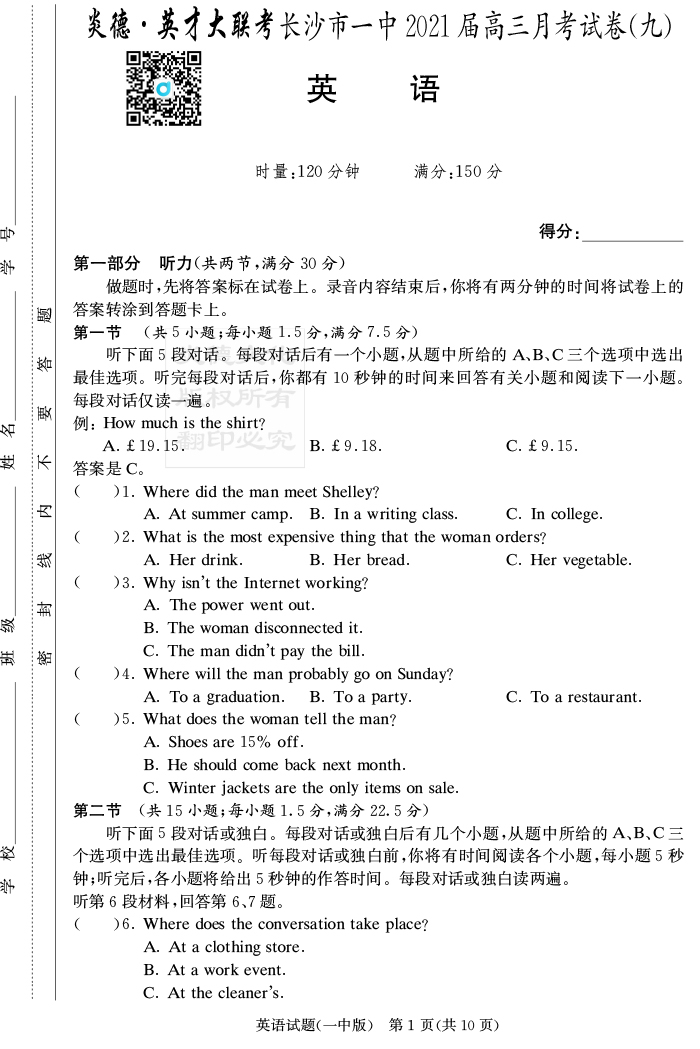 【英語】炎德英才大聯考2021屆長沙市一中高三9次月考