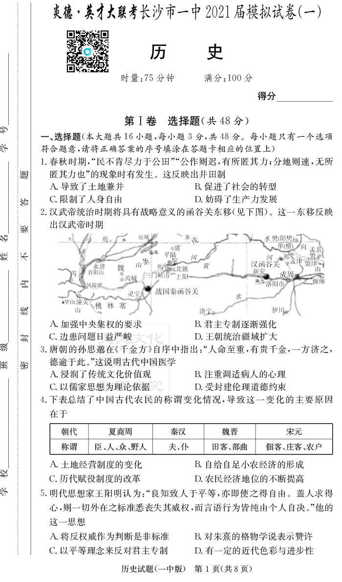 2026長郡中學新高考考前小題沖刺訓練·歷史