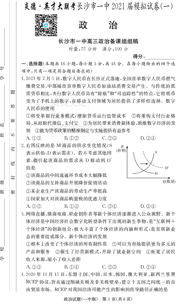 【政治】炎德英才大聯考2021屆長沙市一中高三10次月考(模擬一)