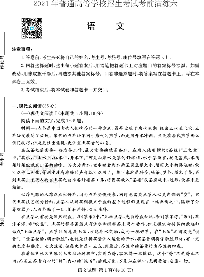 【語文】2021年普通高等學校招生全國統一考試考前演練(六)