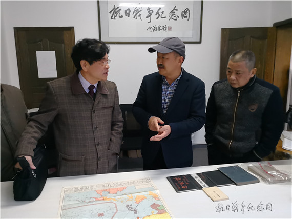 長沙市抗戰文化研究會會長、抗日戰爭紀念網主編、抗日戰爭圖書館館長何譽軍(左二)向長沙市關工委主任董學生(左一)等介紹抗日戰爭圖書館館藏資料