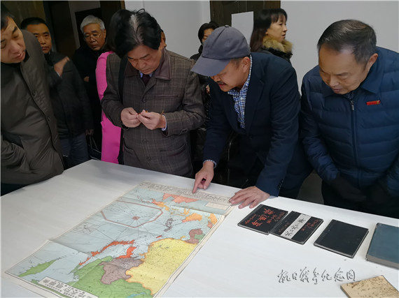長沙市抗戰文化研究會會長、抗日戰爭紀念網主編、抗日戰爭圖書館館長何譽軍(右二)向長沙市關工委主任董學生(右三)等介紹抗日戰爭圖書館館藏資料
