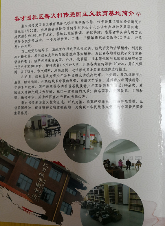 “薪火相傳”愛國主義教育基地由銀盆嶺街道英才園社區與湖南炎德文化實業有限公司于2017年共建。湖南炎德文化實業有限公司董事長、省政協委員何譽軍先生提供抗日戰爭圖書館圖書閱覽室及400佘平方米大廳作為青少年活動基地,并將民間抗日戰爭圖書館免費向社區居民開放。