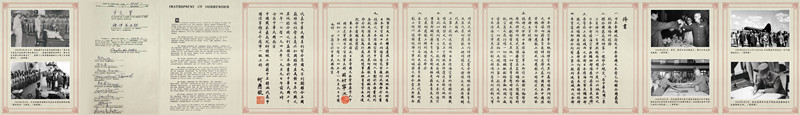 1945年8月15日,裕仁天皇向全國進行廣播接受《波茨坦公告》并且頒布無條件投降詔書,宣布向盟國無條件投降。盟軍最高司令麥克亞瑟隨即率美、中、英、蘇、澳、加、法、荷、新等國的代表赴日本受降。簽字儀式于1945年9月2日上午九時在美國海軍“密蘇里”號戰列艦上舉行。中國代表徐永昌上將在商震將軍陪同下代表中國在投降書上簽字。