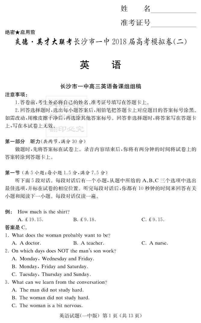 【英語】炎德英才大聯考2018長沙一中高三11次月考(模擬二)